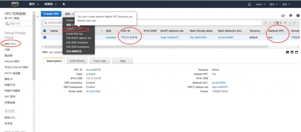 - 在每一个区域(Region),AWS都有一个默认的VPC