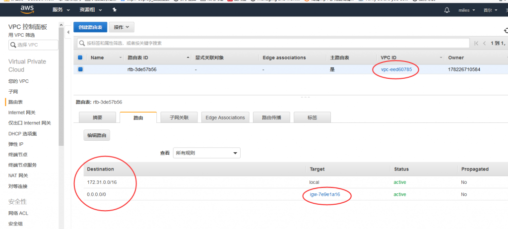 这两个实例关联了一个主路由表,该路由表拥有一个访问172.31.0.0/16 VPC内流量的路由条目;还有一个目的为 0.0.0.0/0 的默认路由条目,指向Internet网关。