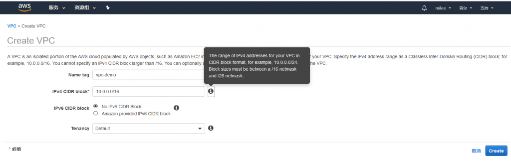 但是因为VPC的子网掩码范围是还会限制只能是从/28到/16,因此你不能设置一个网络是172.16.0.0/12的VPC或者是192.168.0.0/29的VPC。