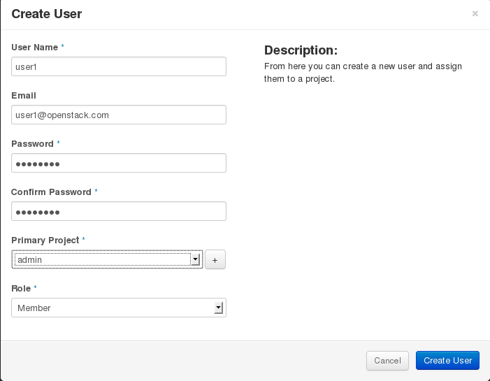 - 在keystone/horizon中创建新用户user1,并且分配tenant和role。注意:密码处可随意填写,在自定义后端中,仅需要MySQL中有该用户存在,并且配置有相应的项目及角色,实际验证时则是通过LDAP验证。因此该处的密码无效。